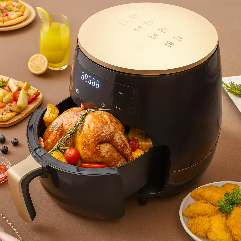 Великий обсяг дозволяє готувати великі порції їжі, які підходять для всієї родини або невеликих заходів. Висока потужність забезпечує швидке прогрівання та рівномірне приготування їжі. Технологія гарячого повітря дозволяє забезпечити хрумку скоринку і соковитість усередині без використання великої кількості олії.