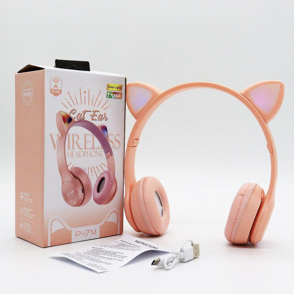 Бездротові Bluetooth навушники з котячими вушками та підсвічуванням Cat Miu Star P47 Рожеві / Дитячі навушники