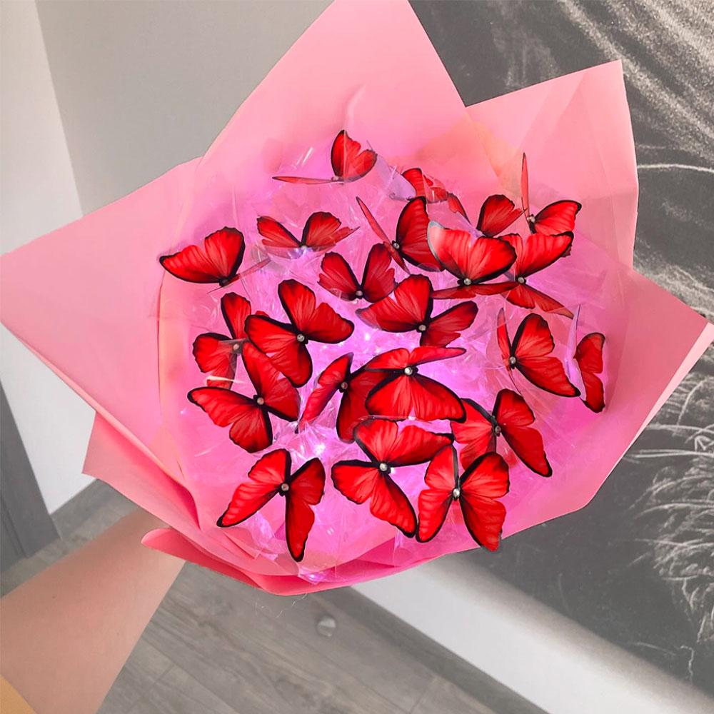 Букет з метеликів з підсвічуванням, від батарейок, Червоний / Букет з метеликами / Подарунок дівчині