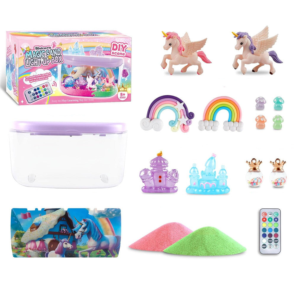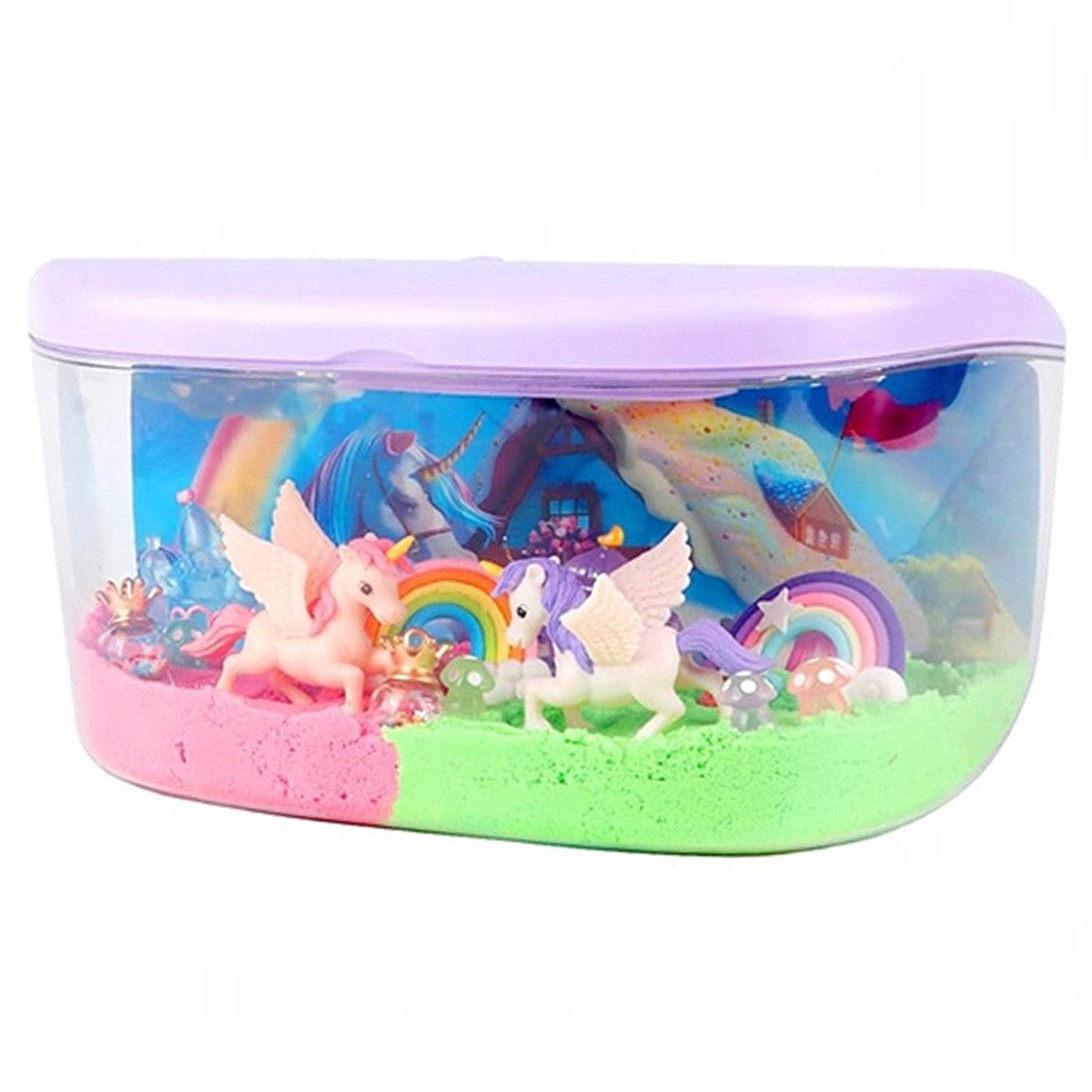 Зануртеся у казковий світ із набором Unicorn Magic Sand Light-Up Box! Цей чудовий комплект дозволить вашій дитині створювати власні чарівні сцени з кінетичним піском, фігурками єдинорогів, замків і елементами, що світяться. Яскраві кольори та чарівна атмосфера надихнуть на творчість та розвиток фантазії. Кінетичний пісок приємний на дотик, легко набуває форми і не розсипається. Він абсолютно безпечний для дітей та сприяє розвитку дрібної моторики, координації рухів та сенсорного сприйняття.