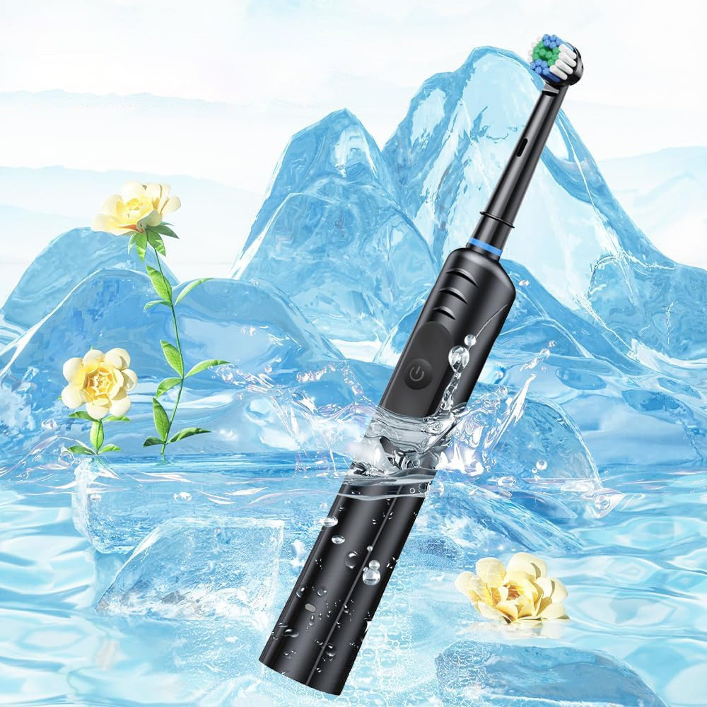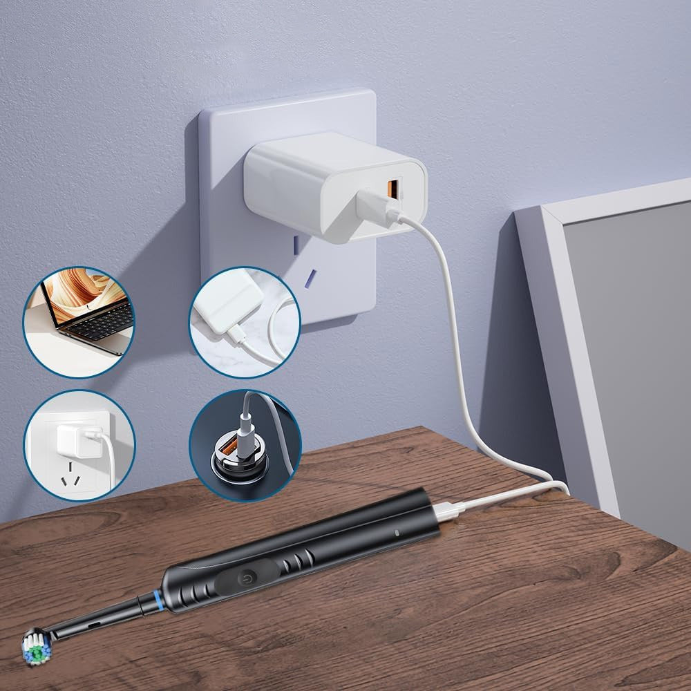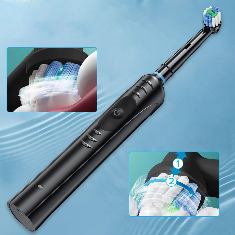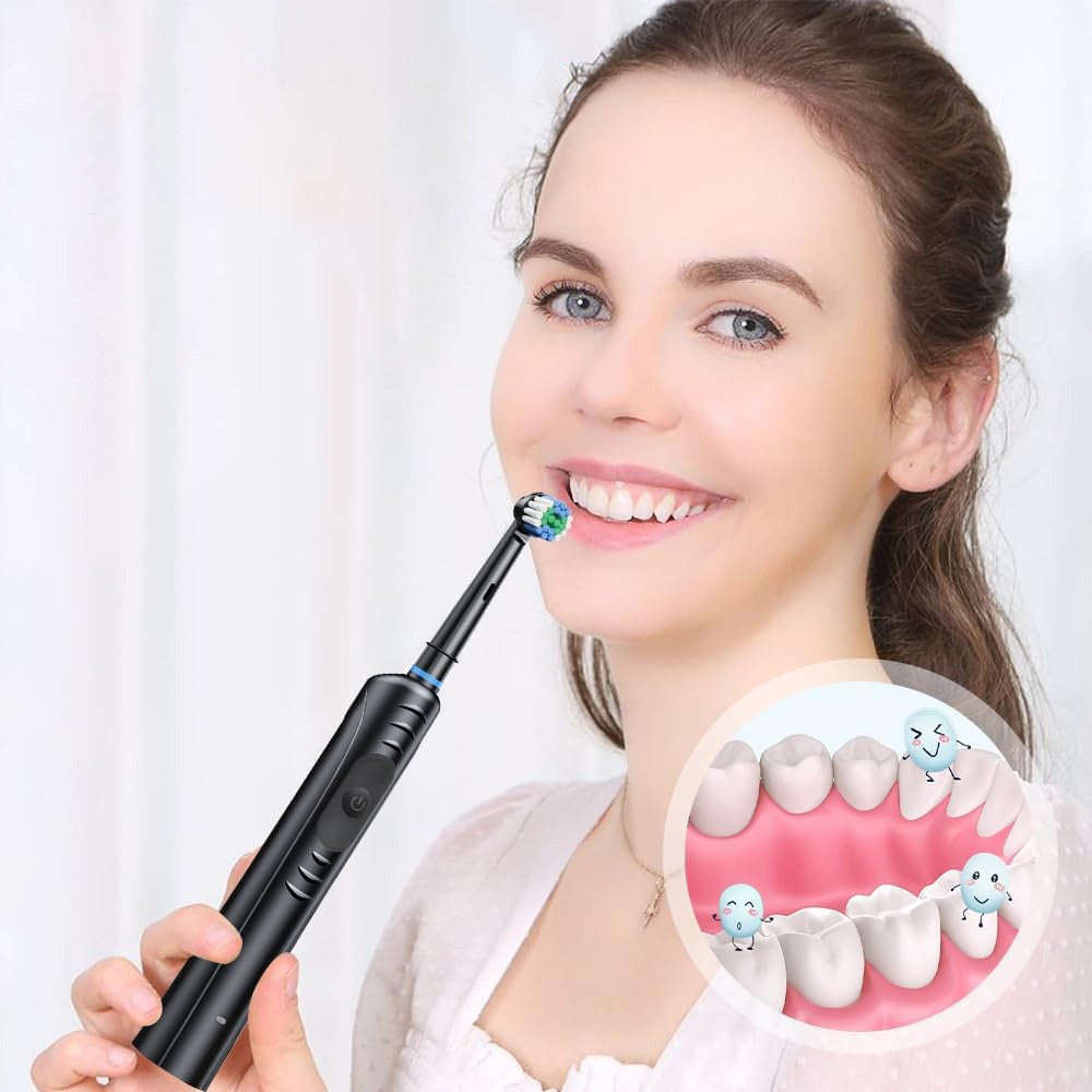 Відчуйте різницю з нашою електричною зубною щіткою! Вона забезпечує більш ретельне чищення порівняно із звичайною щіткою, видаляючи наліт та забруднення навіть у важкодоступних місцях. Високочастотні вібрації ніжно масажують ясна, покращуючи кровообіг і сприяючи їхньому здоров'ю. Насолоджуйтесь відчуттям свіжості та чистоти після кожного чищення!