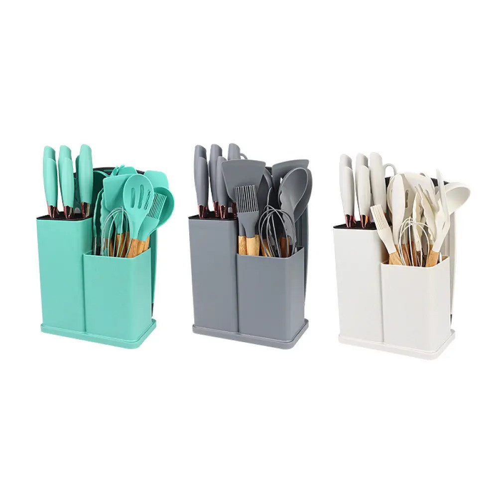 Набір кухонного приладдя з силіконових матеріалів "Kitchen Set" включає 19 різних предметів, необхідних для приготування та подачі їжі. Він містить різноманітні інструменти, такі як лопатка, віночок, різноманітні ножі та дошку для різання, призначені для виконання різноманітних кулінарних завдань.