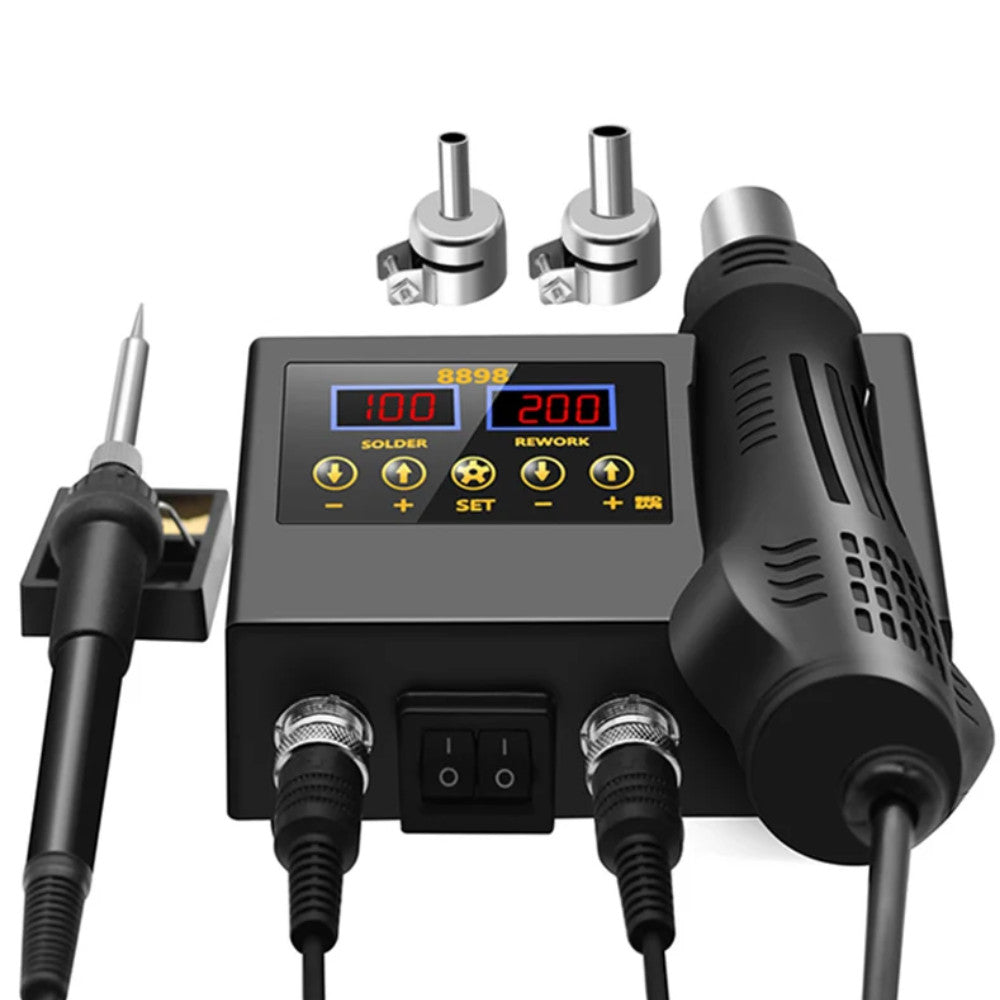 Паяльна станція 2в1 з термофеном — це універсальний інструмент для радіоаматорів та професіоналів, який поєднує можливості паяльника та гарячого фена. Пристрій оснащений керамічним нагрівачем для швидкого виходу на робочу температуру та термостабілізацією для точного підтримання заданих параметрів. Це дозволяє працювати навіть із делікатними компонентами без ризику перегріву.