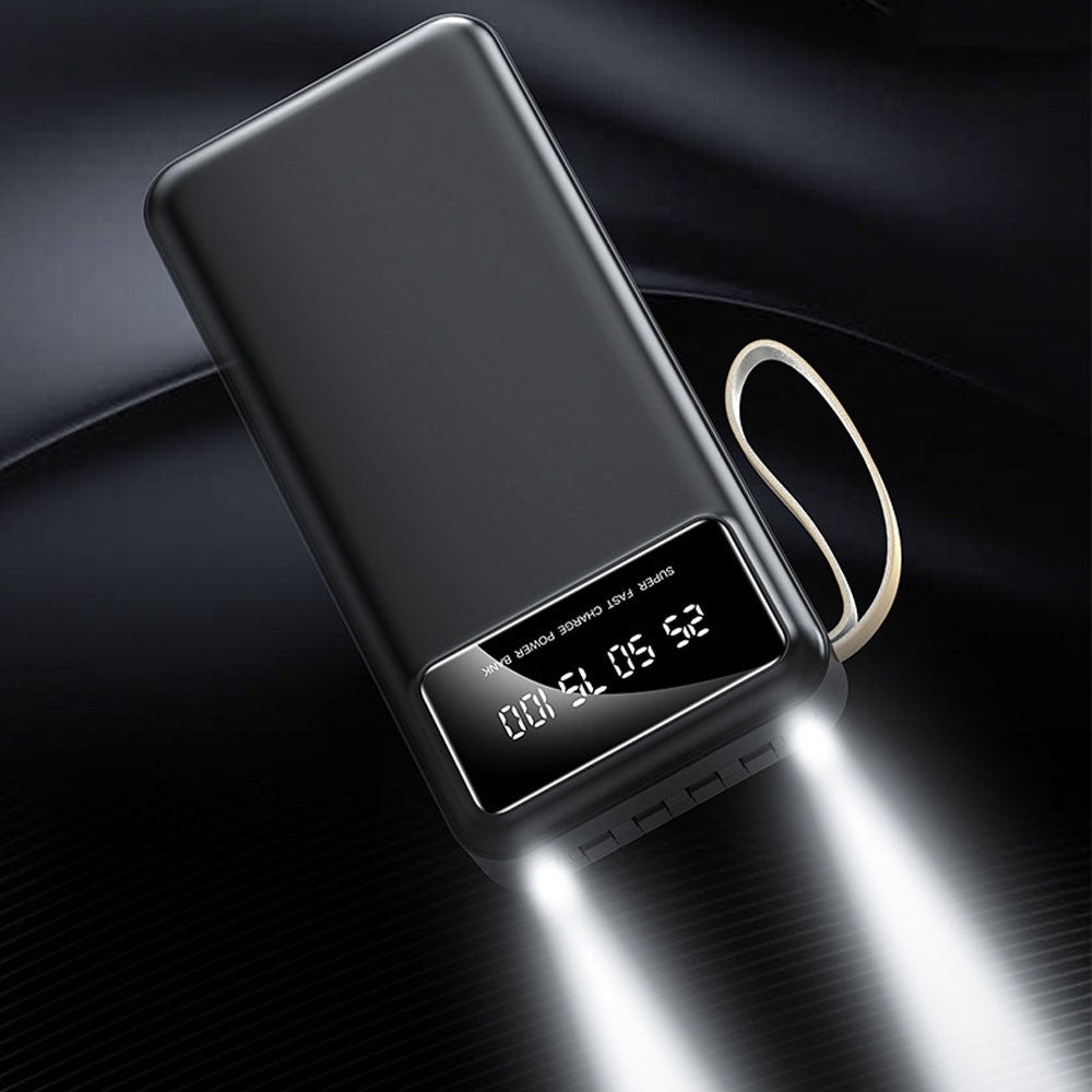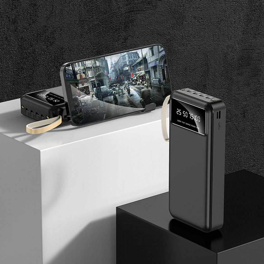 Повербанк на 30000 мАч з ліхтариком та 4 вбудованими кабелями забезпечує потужну та зручну зарядку ваших пристроїв у будь-яких умовах.