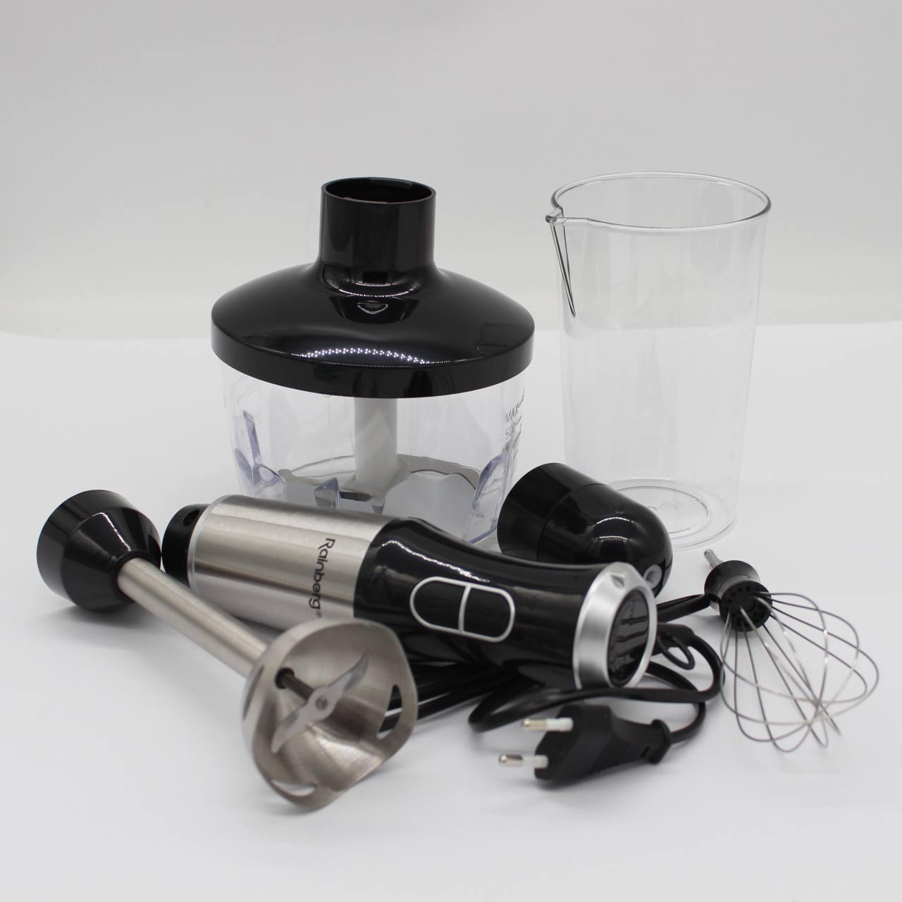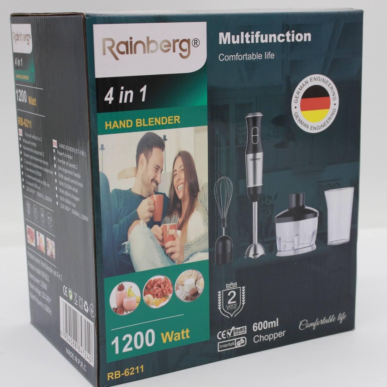 Блендер занурювальний 4в1 Rainberg RB 6211 - хороший надійний, і що найголовніше, цілком доступний, помічник на кухні для більшості сучасних господинь. Адже з його допомогою можна приготувати, подрібнити, перемішати до однорідної маси багато харчових компонентів, починаючи від дитячого харчування та закінчуючи вишуканими, легкими та дієтичними супами-пюре.