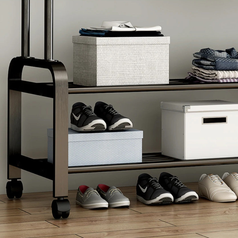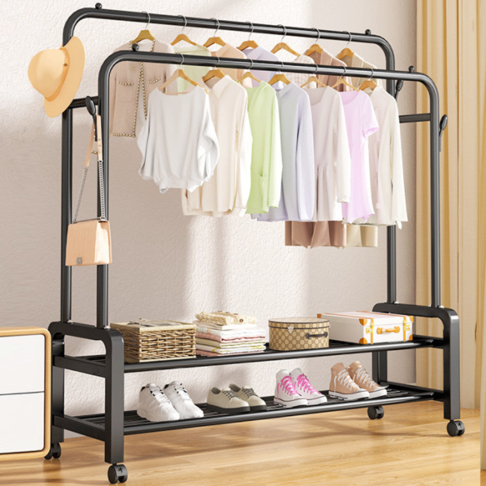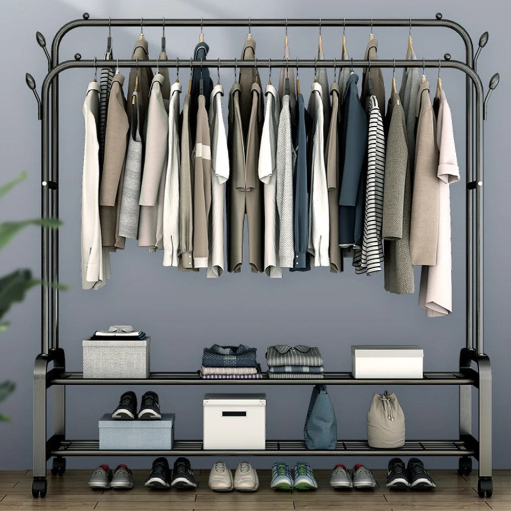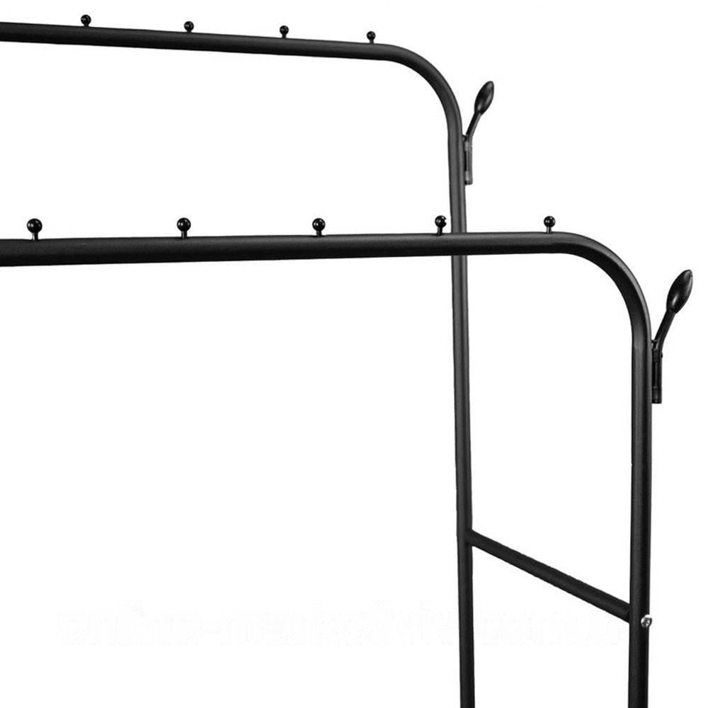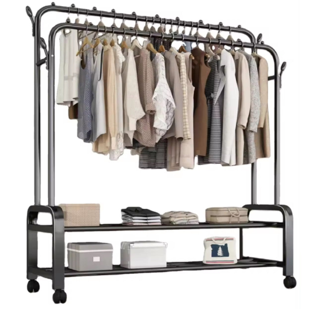 Ця подвійна вішалка для одягу з двома полицями та коліщатками – чудове рішення для компактного зберігання одягу та аксесуарів у вашому будинку.