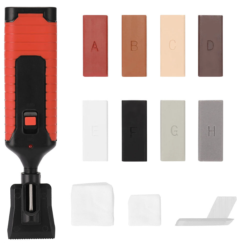 У комплект входить компактна електрична праска довжиною 165 мм, а також 11 воскових блоків розміром 401511 мм кожен, які легко нагріваються і дозволяють заповнити сколи та подряпини. Додатково в наборі є блок, губка, тканина для обробки і зручний кейс для зручності зберігання і транспортування.