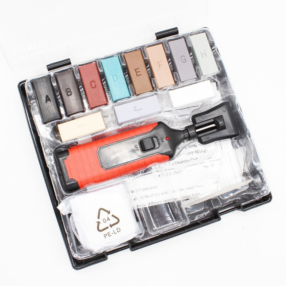 До комплекту входить компактна електрична праска завдовжки 165 мм, а також 11 воскових блоків розміром 401511 мм кожен, які легко нагріваються і дають змогу заповнити відколи й подряпини. Додатково в наборі є блок, що зішкрябує, губка, тканина для оздоблення та зручний кейс для зручності зберігання і транспортування.