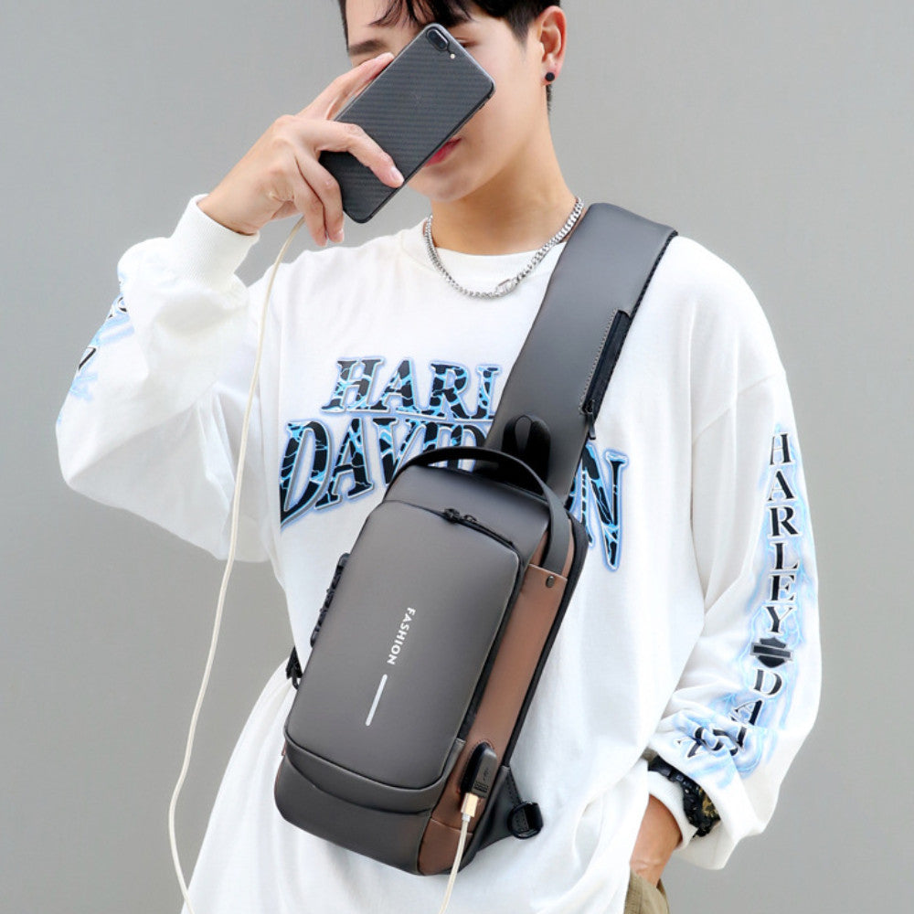 Рюкзак оснащений додатковою короткою ручкою для зручності перенесення рук. Довгий наплічний ремінець за допомогою карабінів можна перестебнути на більш комфортний для Вас бік. Особливістю даної моделі є кодовий замок, який блокує блискавку основного відділу. Також слінг має роз'єм для проводу USB, що дозволяє зручно заряджати телефон, не ховаючи його в сумку.