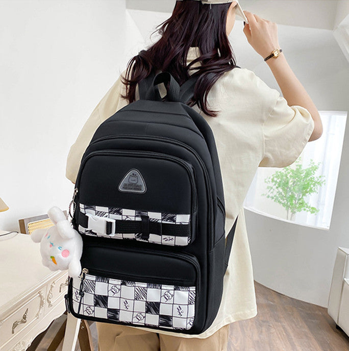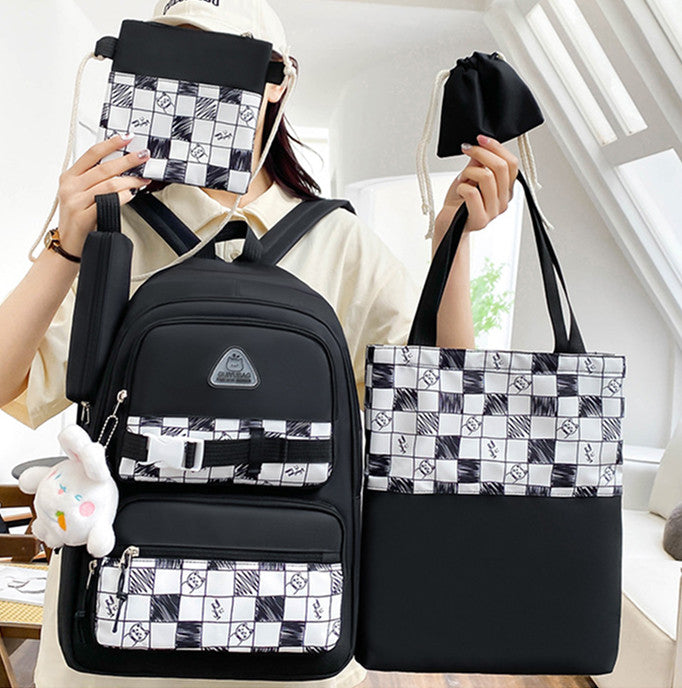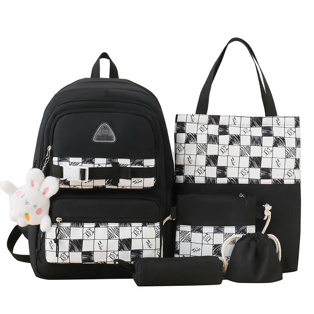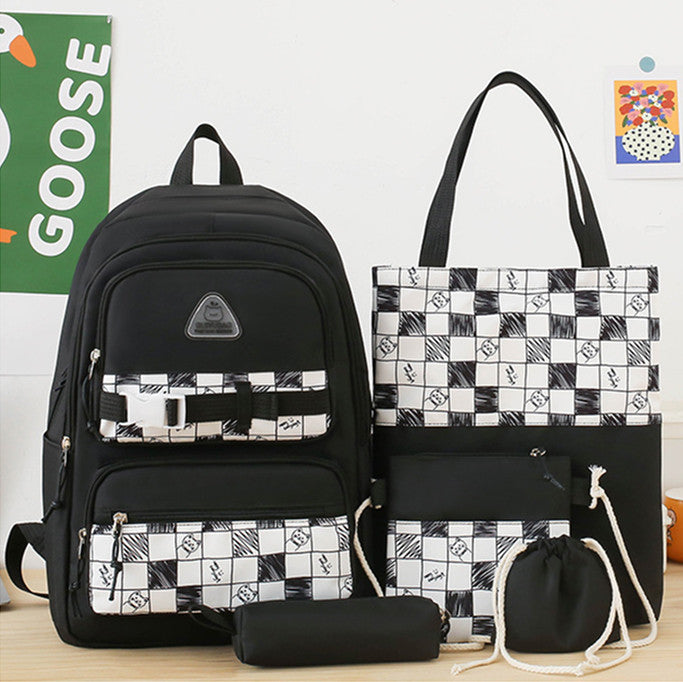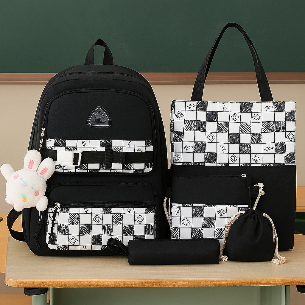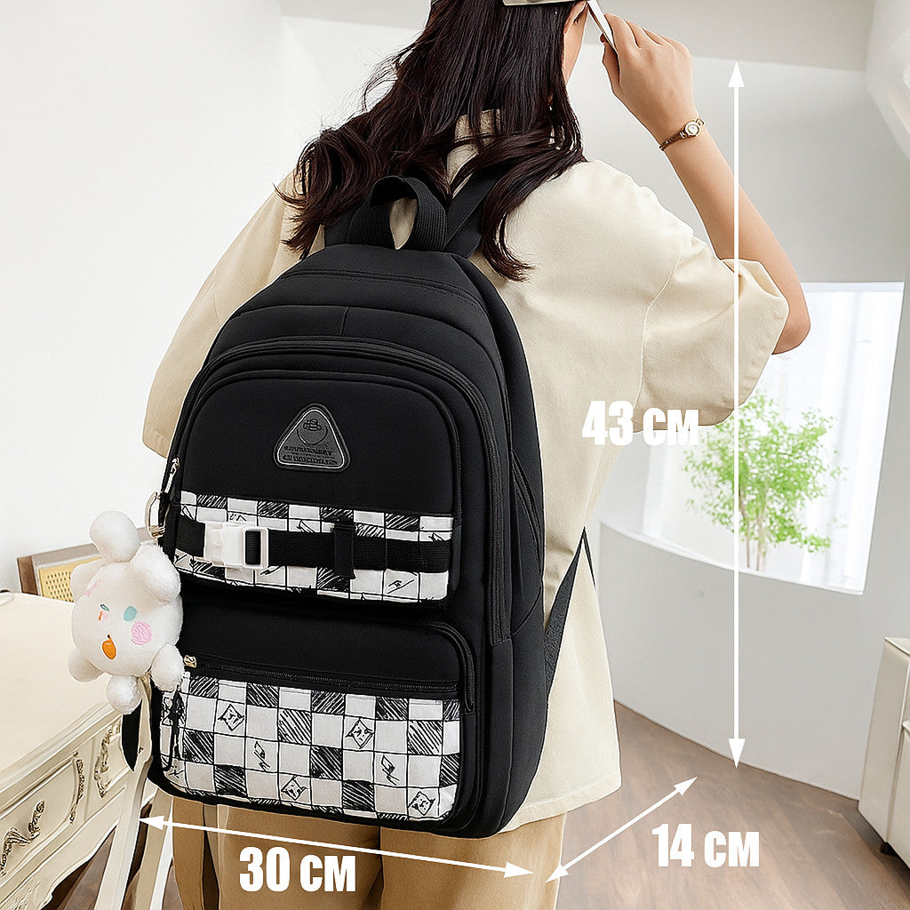 Цей практичний та стильний шкільний комплект з 5 предметів виконаний із міцної парусинової тканини та оформлений у чорно-білу клітку з оригінальним принтом. У набір входять: місткий рюкзак, сумка для змінки або зошитів, кроссбоді-сумка, пенал та мішечок на зав'язці. Рюкзак оснащений зручними відділеннями та зовнішніми кишенями, що робить його ідеальним для навчання та повсякденного використання. Широкі лямки та м'яка спинка забезпечують комфорт навіть за тривалого носіння.